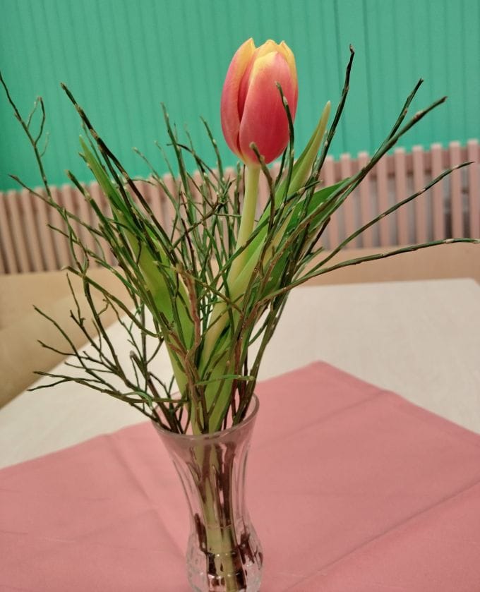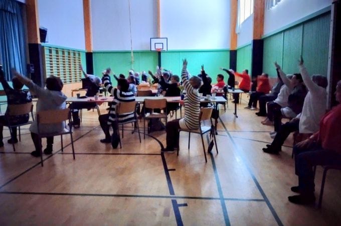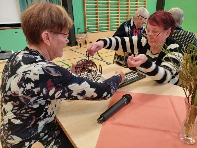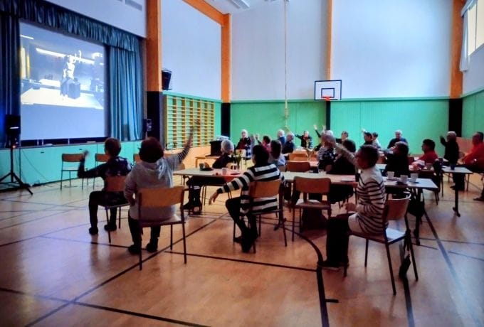 Pelattiin bingoa ja iltapäivän jo kallistuessa pikkuhiljaa, kokeiltiin uudella valkokankaalla hämyisässä valossa musiikkipitoinen tuolijumppa.